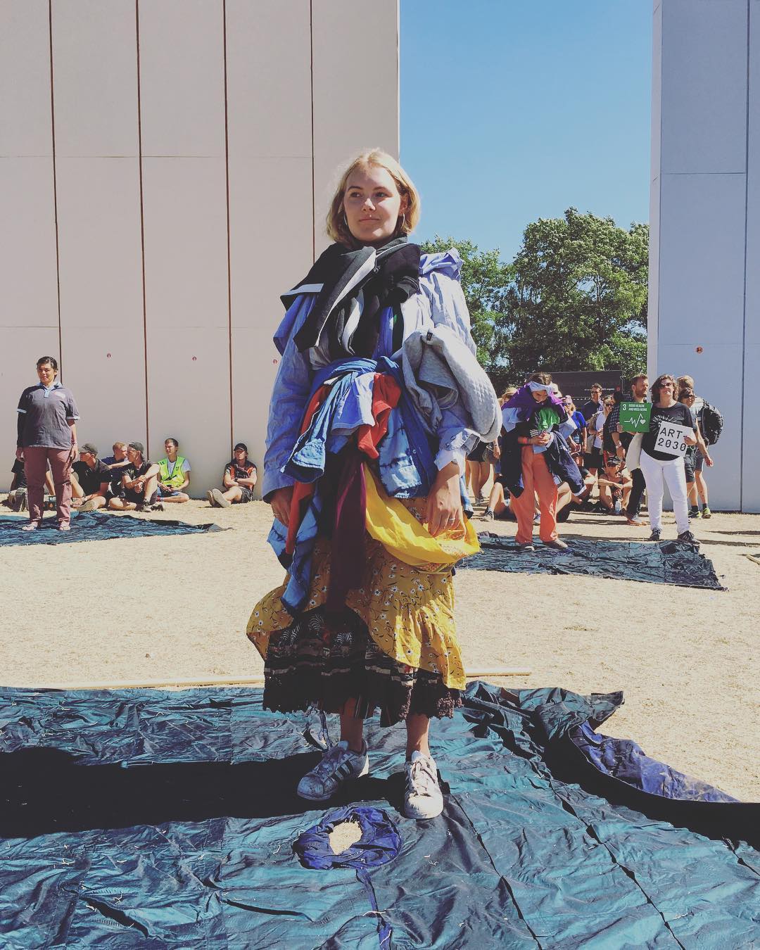 Taking the form of a sculptural performance, the work shines a critical light on the Western World’s over-consumption, with a particular focus on the textile industry, and the many layers of production that precedes our clothes.